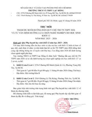 - Thư mời tham dự buổi hướng dẫn quy chế thi TN THPT năm 2026 và tư vấn định hướng lựa chọn nghề nghiệp cho Học sinh khối 12