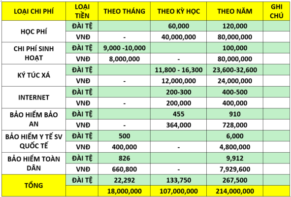 4. Chi Phí Học Tập Và Sinh Hoạt Tại NKUST (Tham Khảo)