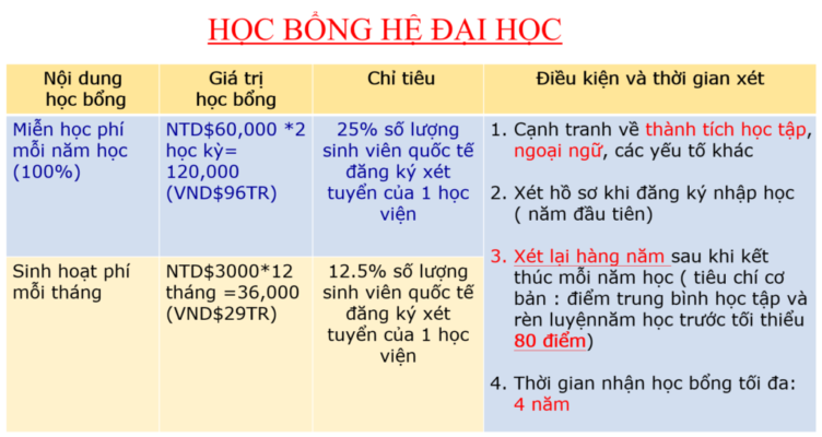 - Điều kiện xét học bổng: Cạnh tranh về thành tích học tập, ngoại ngữ và các yếu tố khác. Xét hồ sơ khi đăng ký nhập học (năm đầu tiên) và xét lại hàng năm dựa trên điểm trung bình học tập và rèn luyện (tối thiểu 80 điểm). Thời gian nhận học bổng tối đa là 4 năm.