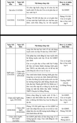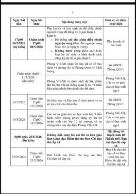 • 16/04 – 21/04/2026: Các cơ sở giáo dục phổ biến văn bản, quy định, hướng dẫn cách thức đăng ký và tư vấn nguyện vọng cho phụ huynh, học sinh.