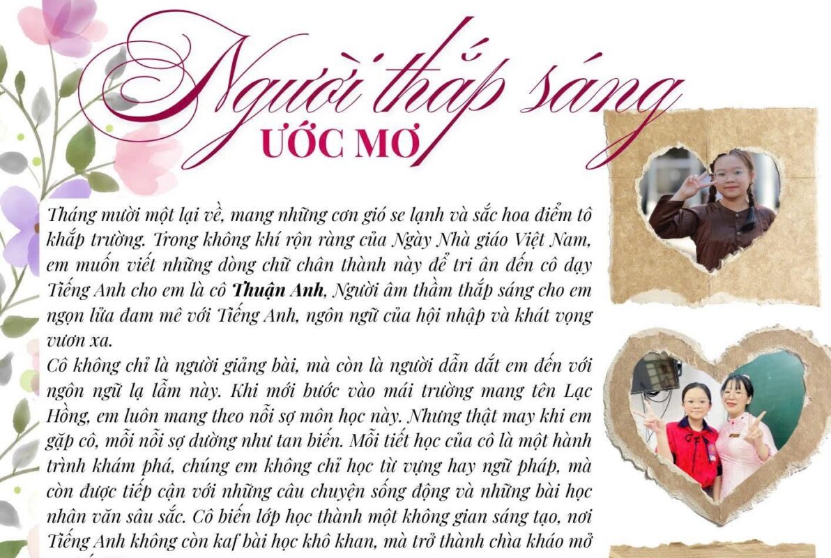 Tháng mười một lại về, mang những cơn gió se lạnh và sắc hoa điểm tô khắp trường. Trong không khí rộn ràng của Ngày Nhà giáo Việt Nam, em muốn viết những dòng chữ chân thành này để tri ân đến cô dạy Tiếng Anh cho em là cô Thuận Anh, người âm thầm thắp sáng cho em ngọn lửa đam mê với Tiếng Anh, ngôn ngữ của hội nhập và khát vọng vươn xa.